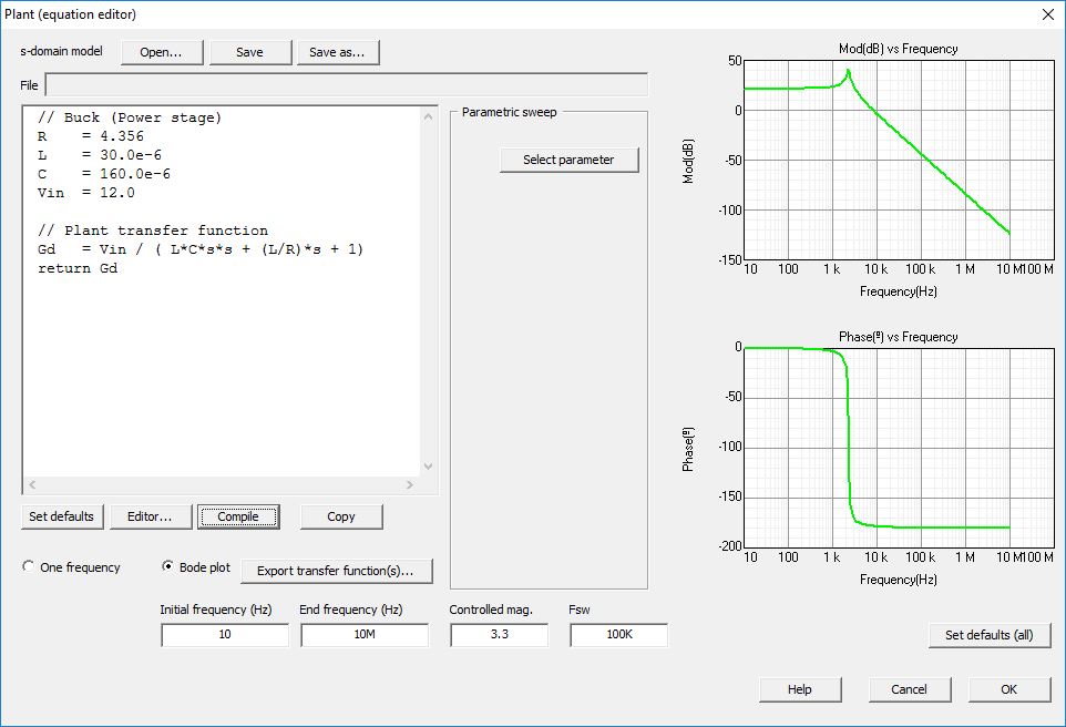 With the Equation Editor, you can customize your own analytical model for your specific converter. The design tools of SmartCtrl then help you to calculate the compensator required.