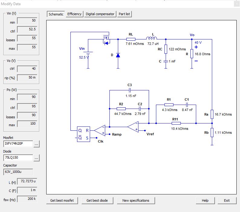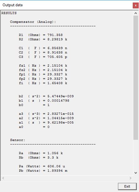 SmartCtrl provides detailed information about the designed compensator (resistor, capacitors or z-domain coefficients), and about the power stage and steady-state waveforms.